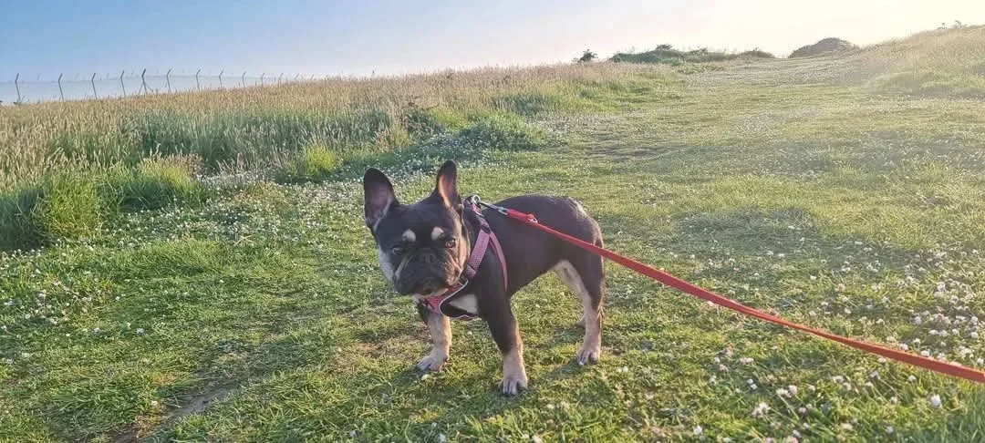 When out she does become very perky and definitely confident, she gets distracted with everything, wants to go and see everyone, she will cry (Walter the frenchie style) when seeing a dog (training to continue walking and ignoring is ongoing). Listens well in the house but has selective hearing when out.