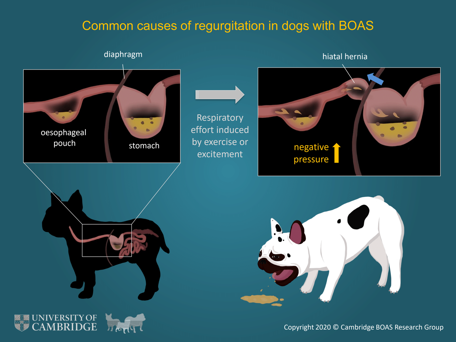 BOAS is a complicated syndrome resulting from multiple abnormalities within the upper and lower airways. Some of these abnormalities can be improved with surgery (e.g. narrow nostrils, overly long soft palate) but others are either impossible or very difficult to treat (e.g. hypoplastic trachea, oversized tongue and thick soft palate). Some dogs also have other abnormalities of skull structure, making their symptoms worse and less likely to improve with conventional surgical techniques.